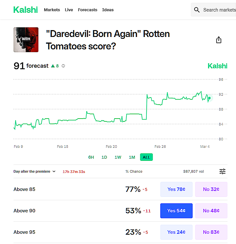 Congress eventually outlawed these contracts; a statutory ban exists today for box office futures as well as onion futures. Fear not though, you can still trade Rotten Tomato score predictions on Kalshi: