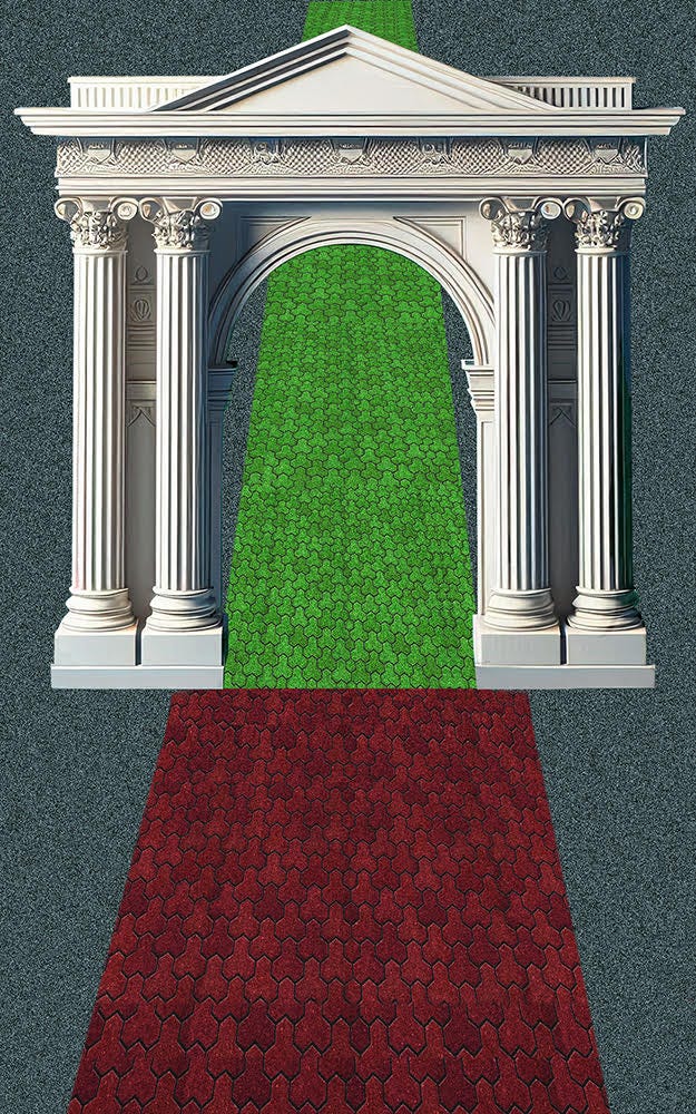 The path is the chance-skill spectrum that delineates gambling. Every possible game resides somewhere on that path. The white arched structure is the gate that is crossed when a game is considered to involve sufficient skill, and therefore is not considered gambling; hence the green floor. If a game does not involve enough skill to advance through that gate, then the game is considered gambling; hence the red floor.