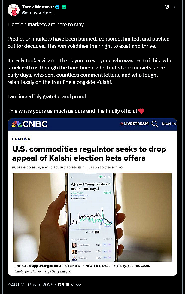 Tarek Mansour, Kalshi’s CEO was obviously relieved: