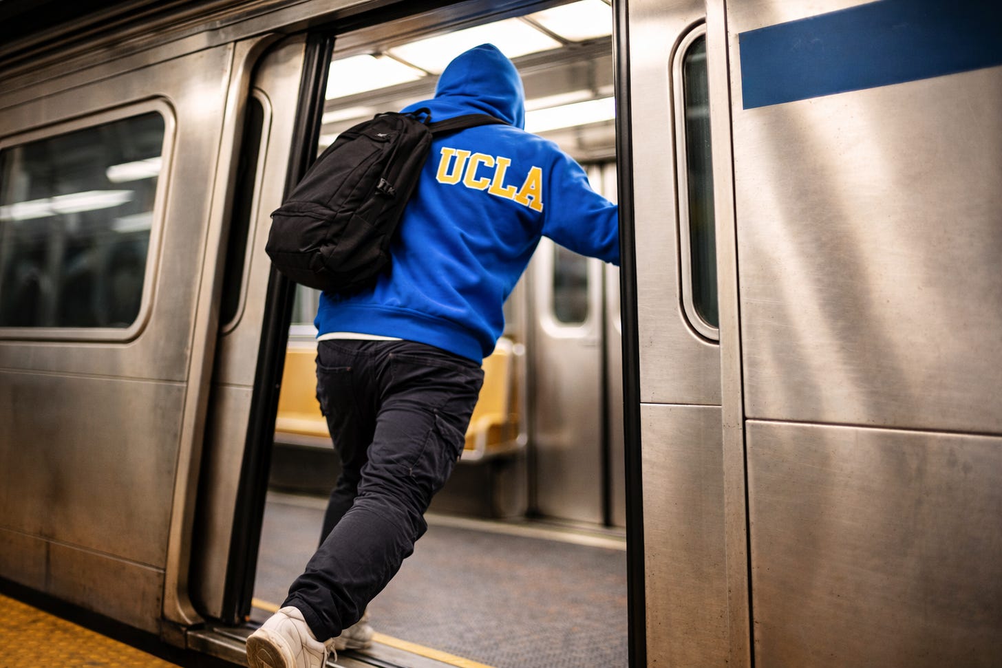Just as the conductor announced “doors closing,” someone in a UCLA hoodie sprinted through the narrowing gap: