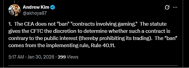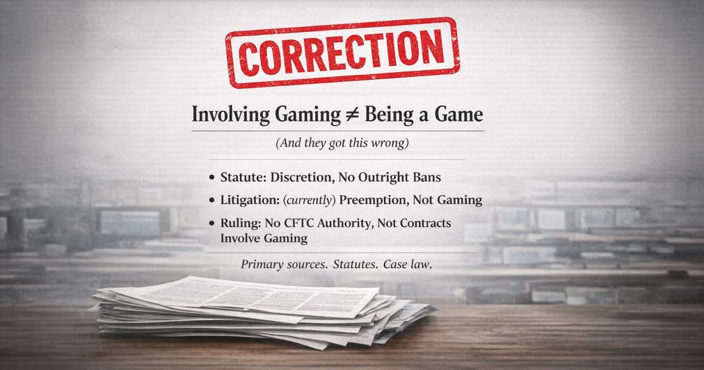 Incorrect. Congress did not ban these categories. It instructed the CFTC to scrutinize them carefully, but left the final determination to the agency. That distinction matters because it helps identify the correct defendant (the CFTC) and the correct legal framework (the APA) (our amicus PDF). What we see today in courts are the wrong defendants (prediction markets) and incomplete arguments (preemption).
