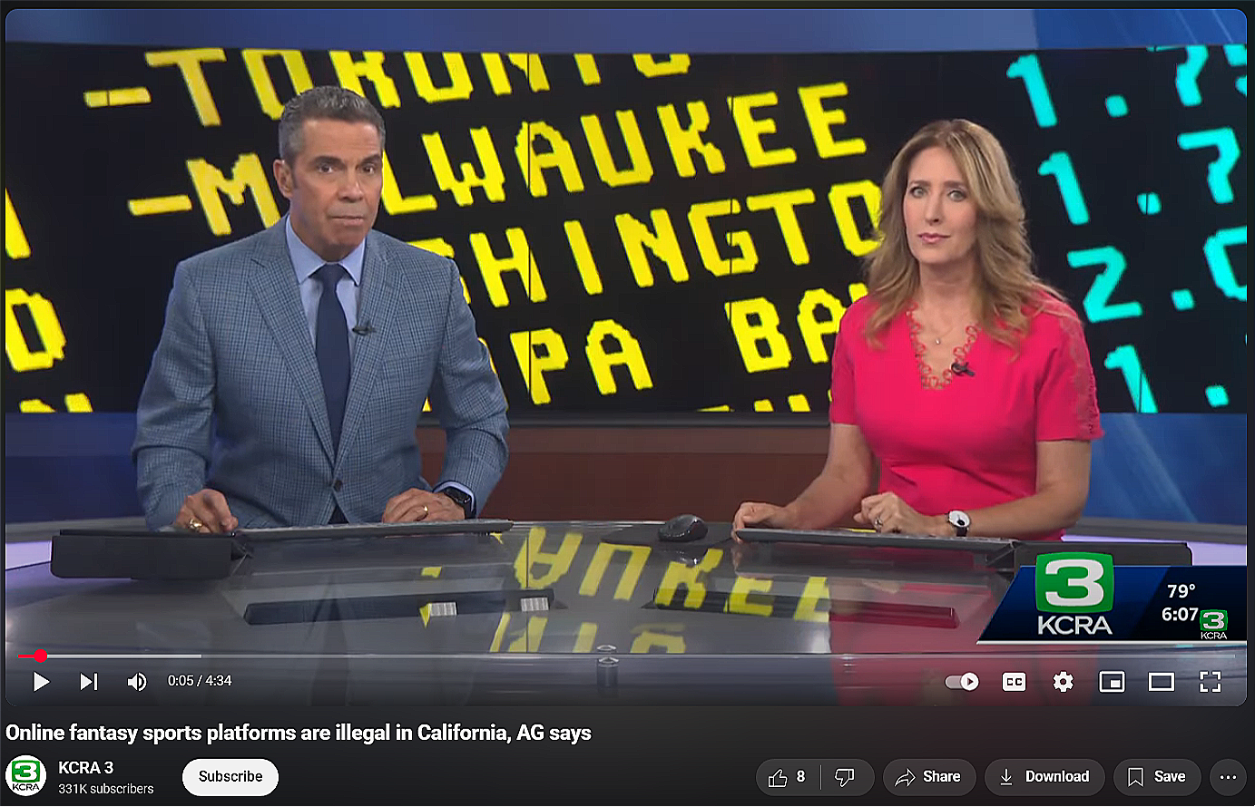 One potential avenue: If daily fantasy sports draws “players” away from tribal casinos–say folks opting for app-based “play” at home instead of brick-and-mortar gambling–the tribes have every incentive to protect their slice of the gambling pie. As the KCRA host said at the end of the second video above, this is “competition for the tribes.”
