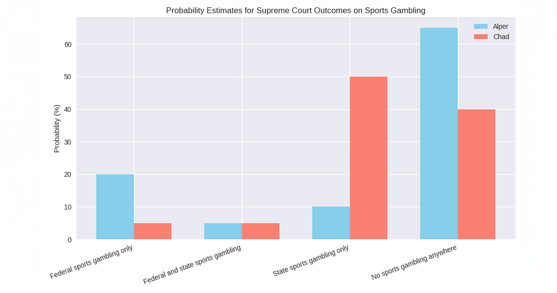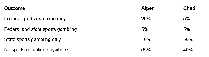 A pure legal analysis leads to the natural conclusion that all sports gambling is prohibited, everywhere. There is always a chance, of course, that the Supreme Court will disagree, or, the incentives involved in politics will play a role. The future of sports gambling in America is what’s at stake after all. Our most material variance was here. Alper believes that SCOTUS will follow where the law leads. Chad believes it will be a closer call, predicting that the state regime is slightly more likely than sports gambling being swept off the table altogether.