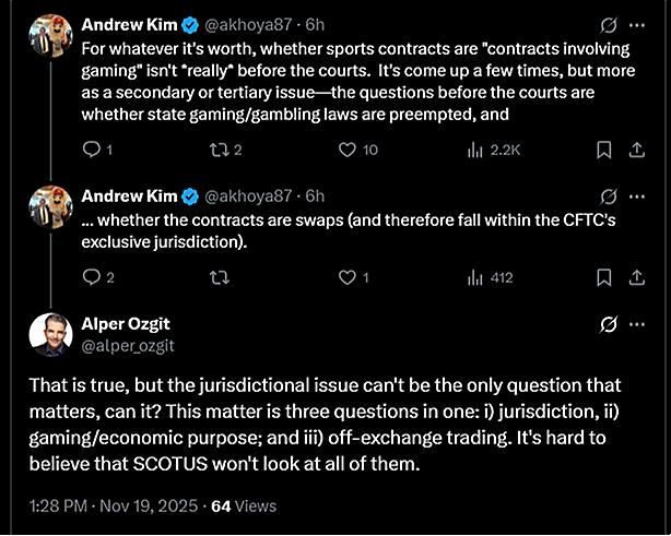 Alternatively, if SCOTUS remains silent on the matter of off-exchange trading, post-SCOTUS litigation will likely eradicate state-regulated sports gambling anyway (more reason for SCOTUS to take up all three questions, and not just the jurisdictional issue).