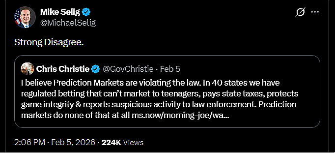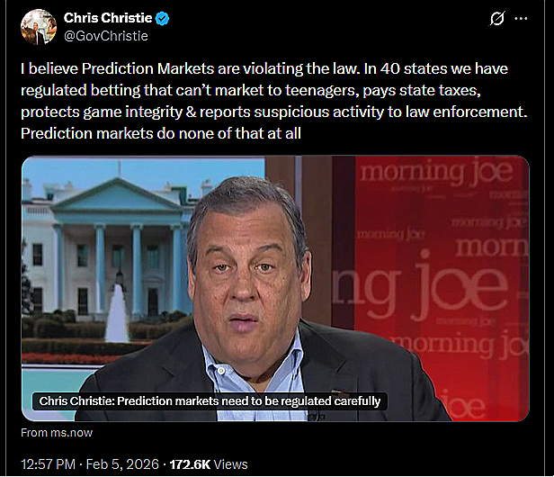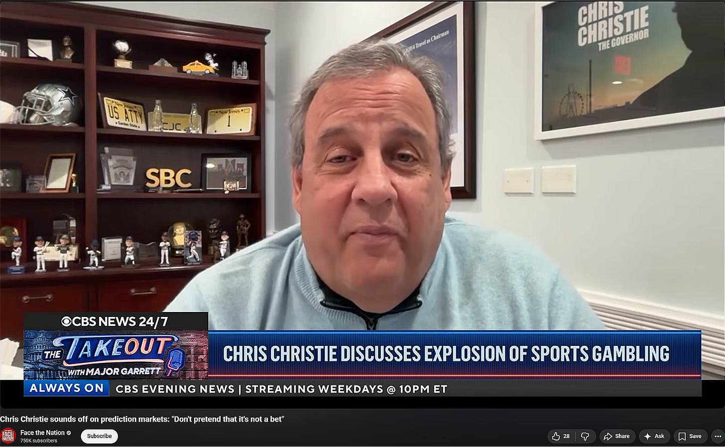 Let us be precise here: Christie, former Governor of New Jersey, believes prediction markets, and only the prediction markets, are flouting the law. Not the state-regulated sportsbooks, of course. They are the “good guys”: Paying taxes to the state, protecting game integrity, keeping minors out, etc.
