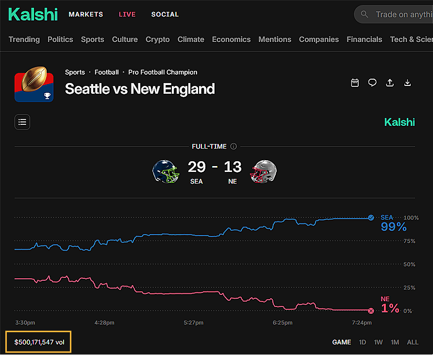 …Kalshi has already seen more than $167 million in bets on the game, and that number could conceivably crack $1 billion…