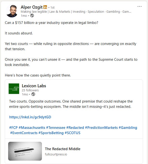 Either way, I recognize that absurd results can follow, especially when enforcement responsibility sits with a single agency that may have been wary of the political fallout. Perhaps they thought: “SCOTUS hasn’t spoken on the CEA’s role in sports gambling, so why should we?”